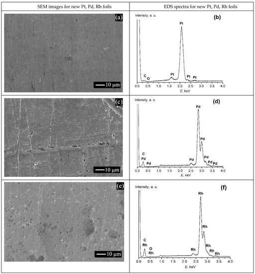 According to EDS data, the new samples Pt(poly), Pd(poly) and Rh(poly) contain, in addition to metals, only C and O impurities; other impurities are not detected. It should be noted that the detection limit of elements for standard EDS analysis is ca. 0.1 wt.%. Therefore, it is impossible to detect the impurity elements that could be present in the metals according to GOST 13498-2010, 13462-2010 and 13098-2006 in the concentration ≤0.1 wt.%. In addition, according to these GOSTs, the above-listed impurities can be absent in the metals (see below Section 4).