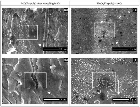 Figure S1 (Supplementary Materials) displays the SEM images of the Pt(poly) surface after treatment in O2 at 1100 K and Po2 = 1 bar for 3 h. At low magnifications (Figure S1a,b), distinct grain boundaries separating grains with different brightness are detected on the surface. At high magnifications (Figure S1c,d), a continuous layer of regular facets is observed on the grain surface. Parallel stepped crystal facets with a step height from 50 to 100–200 nm fill the entire surface of each grain. Flat layered facets ca. 10 nm in height are detected on the surface of such stepped facets (Figure S1d). The microfaceted surface of Pt(poly) was also observed in our earlier study after annealing in the O2 atmosphere at 1300 K [21]. Figure 3 displays SEM images of the Pd(poly) (a–d) and Rh(poly) (e–h) surface after treatment of the samples in O2 at 1100 K and Po2 = 1.0 bar for 3 h. For Pd(poly), a continuous nonuniform layer containing fragments of different shapes and sizes that are separated with cracks 0.1–1.0 µm in width is detected at low magnifications (Figure 3a,b). The images in Figure 3a,b most likely demonstrate the partially decomposed surface oxide layer. Taking into account that the oxygen concentration in Pd(poly) after annealing in O2 at 1100 K is equal to 48.6 at.% (Figure 2a), the oxide layer in Figure 3a–d can be attributed to PdO oxide. At high magnifications, crystal particles of PdO oxide with the size of 50–200 nm are detected in the oxide layer (Figure 3c). In the right and left parts of the image displayed in Figure 3c, one can see particles with such a size, which was estimated using the dimension mark in the image. In Figure 3c,d, a crack with a width of ca. 500 nm is observed in the oxide layer; it was used to estimate the thickness of the oxide layer at 100–200 nm. In addition, a crystal Pd facet with a height of ca. 100 nm is detected in this crack.