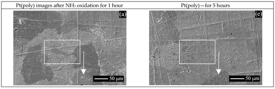 Thus, after NH3 oxidation on Pt(poly) at 1133 K for 1, 5 and 10 h, the microgranular structure of metallic platinum with a grain size of 50–100 µm is detected on the surface. The grain surface predominantly contains regular, similarly separated crystal facets. In all cases, particles and/or crystals of such platinum oxides as PtO2 were not observed. This is consistent with the temperature dependence of equilibrium O2 pressure above PtO2(solid), which testifies to the stable metallic state of Pt under the conditions of NH3 oxidation used in this study (Figure 2b). In addition, a comparison of images of the Pt(poly) surface after annealing in O2 (Figure S1) and after NH3 oxidation (Figure 4) at a temperature of ca. 1100 K shows their close microstructures. In both cases, the microgranular structure of metallic platinum with the faceted grain surface was observed; however, after annealing in O2, the height of facets is 100–200 nm, while after NH3 oxidation, facets with a size up to 1–2 µm are detected. This indicates that the etching of the Pt(poly) surface is more intense during the catalytic oxidation of NH3 as compared to annealing in O2. In [11], after NH3 oxidation for 386 h, both the terraces 5–10 µm in width with ca. 1 µm high facets, and crystal “cauliflowers” with the size of 5–20 µm were found on the surface of platinum wire.