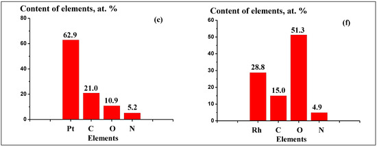 Figure 5 displays data on the chemical composition of the Pt(poly) (a–c) and Rh(poly) (d–f) after NH3 oxidation at 1133 K for 1 (a,d), 5 (b,e) and 10 (c,f) hours according to EDS data. The concentrations of Pt, C, O and N in the three squares differed insignificantly from each other, so they were used to calculate the average concentrations. Figure 5 indicates the obtained averaged concentrations of these elements after NH3 oxidation for 1 (a), 5 (b) and 10 (c) hours. After NH3 oxidation for 1 h, the concentrations of Pt, C, O and N were equal to 60.7, 29.3, 5.7 and 4.3 at.%, respectively (Figure 5a). It should be noted that the obtained oxygen concentration (5.7 at.%) was close to that obtained after annealing of Pt(poly) in O2 at 1133 K (ca. 10.0 at.%, as shown in Figure 2a). It should also be noted that C and O were detected on some regions of the new Pt(poly) sample in the concentration of ca. 28.2 and 0.7 at.%, respectively. The detected carbon may include C atoms as the absorbed Cab atoms on such defects as dislocations and grain boundaries in subsurface layers of the sample. Most likely, O and N atoms detected by EDS include predominantly the Oab and Nab atoms that were absorbed on defects in subsurface platinum layers. As the NH3 oxidation time is extended from 1 to 5 and 10 h, a gradual decrease in the concentration of C (29.3, 26.6, 21.0 at.%) and its growth for O (5.7, 10.1, 10.9 at.%) are observed. The N concentration remains virtually constant, equal to 4.3, 6.4 and 5.2 at.%. Changes in the concentration of detected C and O with the extension of the NH3 oxidation time testify to a gradual removal of Cab from the subsurface region and accumulation of Oab atoms in this region.