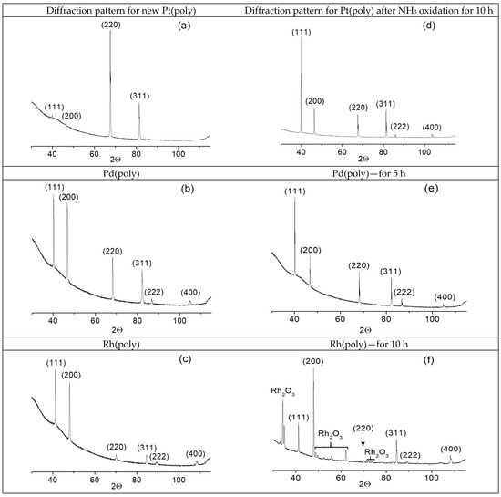 The phase composition of new Pt, Pd and Rh foils, and those used in NH3 oxidation was studied by XRD. Figure 8 displays the diffraction patterns obtained in the range of diffraction angles (2θ) from 30 to 115° for new samples (a–c) and also for those after NH3 oxidation at 1133 K during 10 (d,f) and 5 h (e) for the Pt(poly) (a,d), Pd(poly) (b,e) and Rh(poly) (c,f). The indicated diffraction patterns contain the diffraction peaks for these metals, which are denoted by indices (hkl).