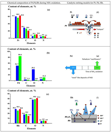 Figure 10a–c indicates the concentrations of metals and C, O, N estimated by EDS on Pt(poly) (a), Pd(poly) (b) and Rh(poly) (c) after NH3 oxidation for 1, 5 and 10 h. These values were taken from the data of Figure 5 and Figure S2. The concentrations of elements in Figure 10a–c reveal the chemical composition of the etched structures that were formed on these metals upon oxidation of NH3. Figure 10d–f present models of the catalytic etching initiated by the oxidation of NH3 at 1133 K for Pt (d), Pd (e) and Rh (f). These models are based on the analysis of images, concentrations of the detected elements and structural characteristics according to SEM, EDS and XRD data obtained for these metals after NH3 oxidation for 1, 5 and 10 hours. For Pt, Figure 10d shows the Oads and Nads atoms adsorbed on the surface, while Oab and Nab atoms absorbed on defects are indicated in the subsurface region of the metal; in addition, Pt atoms segregating from defects to the surface are also seen. These atoms gradually form crystal facets that are detected on the grain surface. For Rh, Figure 10f displays the Rh2O3 oxide layer on the metal surface; O2– and Rh3+ ions are indicated in the layer as well as the Rh0 atoms segregating to the surface. One can see the pyramidal structures formed during the oxidation of NH3 on the oxide surface. For Pd, Figure 10e presents the model diagram showing the oxidation of NH3 and catalytic etching according to different models. At t = 1 h—according to the model that is close to that proposed for Rh (Figure 10f), while at t = 5 h—according to the model for Pt (Figure 10d).