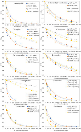 For comparison to previously reported results dealing with the degradation of psychoactive pharmaceuticals using g-C3N4 photocatalysts, Kane et al. [22] studied the degradation of carbamazepine under UV light irradiation using g-C3N4 and g-C3N4/TiO2 photocatalysts, reporting that composite materials possess higher degradation activity. More specifically, removal percentages were 71.41% and 5.97% for 10% g-C3N4/TiO2 and g-C3N4, respectively. In addition, Moreira et al. [23] studied the photocatalytic degradation of nine organic pollutants (including three psychiatric drugs, namely carbamazepine, venlafaxine, and fluoxetine) found in biologically treated effluents of an urban wastewater treatment plant (North Portugal) using exfoliated g-C3N4. At the end of the photocatalytic process, an almost complete removal of all compounds was observed.