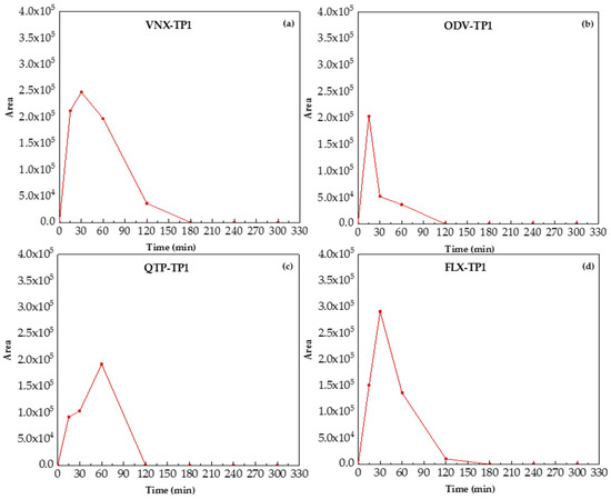 Evolution profiles of (a) venlafaxine TP1, (b) O-desmethyl venlafaxine TP1, (c) quetiapine TP1, and (d) fluoxetine TP1, formed by photocatalytic oxidation process at the laboratory-scale pilot plant using 1MoS2/g-C3N4.