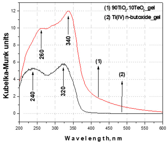 The UV–visible analysis is considered a non-destructive and it is a powerful tool for exploring the optical features of nanocomposite powders [10]. Numerous factors influence the absorbance, such as surface, impurity centers, oxygen deficiency, and bandgap [10]. The optical absorption spectra of both gels 90TiO2.10TeO2 and Ti(IV) butoxide were shown in Figure 4. The absorption edge and optical band gap values of the samples are summarized in Table 1. The UV-Vis spectra exhibit two maxima 240–260 nm and 320–340 nm which could be assigned to the isolated TiO4 and TiO6 units, respectively [50]. As it seen from the figure, for TBT gel, the intensity of UV peaks in the spectra at 240 nm and that near 320 nm are compatible which is an indication of the compatible amount of TiO4 and TiO6 polyhedra in the gel network. In the 90TiO2.10TeO2 gel the peak at 340 nm is dominant which is a result of additional activation of hydrolysis-condensation processes [50]. The other peculiarity is the red shift of the absorption edges in the spectra. These observations are consistent with the reports in the literature for Te— and C—modified TiO2 compositions [51,52]. It was reported that [53] the doping of elementary Te into TiO2 induced an increase in absorption due to smaller band gap of Te than that of TiO2 (0.3 vs 3.2 eV). The UV-Vis spectra were also used to determine the optical band gap (Eopt) of investigated sample (Table 1). The obtained data are corroborated by the literature data [54].