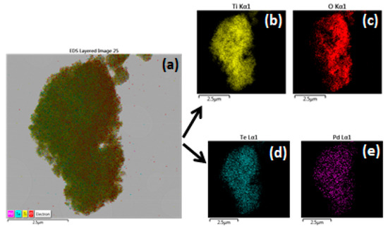 (a) Integral XEDS-STEM composition map from selected area of sample 90TiO2/10TeO2/Pd heat treated at 600 °C; (b) composition map of Ti; (c) composition map of O; (d) composition map of Te; (e) composition map of Pd.