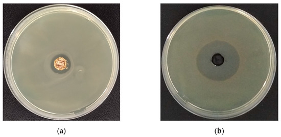 Antibacterial test result of the sample 90TiO2.10TeO2: (a) heat treated at 200 °C and (b) 400 °C against E. coli K12 407.