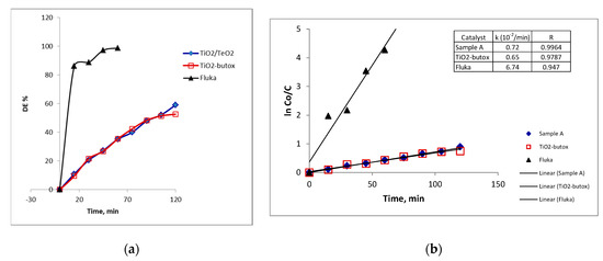 Semi-logarithmic plots of the concentration data gave straight lines, from which slopes the rate constants are derived (Figure 9b). The rate constants of synthesized TiO2/TeO2 sample, pure TiO2 and the commercial TiO2 are 0.0072, 0.0065, and 0.0674 min−1, respectively. All correlation coefficients (R2) were higher than 0.947. As it is also seen from the figure, the best photocatalytic activity showed commercial pure TiO2 (Fluka) with 100% decoloration efficiency after 60 min irradiation. The photodegradation efficiency of the TiO2/TeO2 sample was similar to that of synthesized from Ti(IV) butoxide pure TiO2—both achieved only 35% bleaching after 60 min irradiation, and less than 60% after 120 min of illumination. It is well known that the photocatalytic activity of doped TiO2 depends on many factors, such as synthesis method, dopant concentration, light source, particle size, and surface area. Obviously, at our experimental conditions, the presence of tellurium was not beneficial to the photoactivity under UV irradiation.