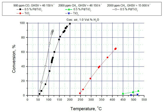 The above-described properties of sol-gel derived 90TiO2.10TeO2 offer the possibility to develop a thermally stable material with potential application in the environmental catalysis. In order to investigate this possibility, catalytic activity tests in the oxidation of CO and methane were performed. The modification of TiO2 by Pd leads to remarkably high activity in the reaction of CO oxidation (Figure 10). At high gas hourly space velocity (GHSV = 46,150 h−1) and in the presence of 1 vol. % water vapor, the reaction begins at almost ambient temperatures (50 °C). For practical application it is of interest to predict the activity at gas hourly space velocities ranged at 15,000 h−1. The results, obtained by the mathematic modeling using the data at GHSV = 46,150 h−1 and recalculated further to GHSV = 15,000 h−1 are presented in Figure 11. Obviously, in the presence of water vapor one may achieve T90 (temperature for conversion of 90%) conversion of CO at 120 °C, T50 being 89 °C.