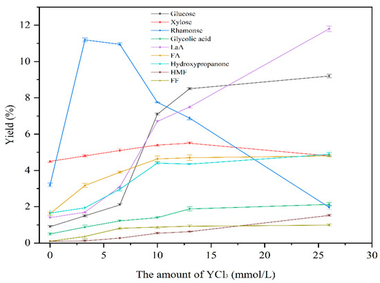 It has been reported that the hydrothermal conversion of U. prolifera could obtain high yield monosaccharides at 160 °C [21]. Firstly, the impact of different amounts of YCl3 (3.25 mmol/L, 6.5 mmol/L, 10 mmol/L, 13 mmol/L, 26 mmol/L) on the hydrothermal conversion of polysaccharides was also explored at 160 °C. As shown in Figure 1, it was interesting to note that the highest amount of rhamnose was obtained when 3.25 mmol/L YCl3 was added, and the yield of rhamnose decreased continuously with the amount of YCl3, whereas the yield of LaA increased monotonically with the amount of YCl3. The yield of xylose climbed up and then declined with the increasing amount of YCl3, and when 10 mmol/L YCl3 was added, the maximum yield of xylose could be obtained. Additionally, the yield of glucose increased firstly with the rise in the amount of YCl3, and upon adding 13 mmol/L YCl3, the highest amount of glucose could be obtained, which remained almost unchanged with an increase in the amount of YCl3, suggesting that glucose and xylose could be extracted from the raw material but were hardly converted to LaA at 160 °C under the roles of YCl3 derived catalysts. This may be caused by the difficulty of C-C bond cleavage in glucose and xylose. The yield of HMF and FF was low and increased slightly with the amount of YCl3 increased, showing that small amounts of glucose and xylose could be converted to HMF and FF, respectively, at 160 °C. The above data implied that the increased LaA, FA, and hydroxypropanone were mainly originated from the conversion of rhamnose at 160 °C, catalyzed by YCl3-derived catalysts under the present conditions, whereas glucose and xylose could only be extracted, but not converted to LaA.