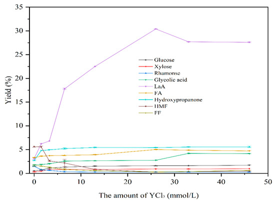 Secondly, we explored the effect of the amount of YCl3 on the conversion of Ulva prolifera at 200 °C. The amount of YCl3 used was (0.0, 1.5 mmol/L, 3.25 mmol/L, 6.5 mmol/L, 13 mmol/L, 26 mmol/L, 33 mmol/L, and 46 mmol/L). As shown in Figure 2, the same as the yield at 160 °C, the yield of LaA was at a low level without a catalyst. The yields of glucose, xylose, and rhamnose were also low, and the polysaccharides in U. prolifera were hard to be converted and dissolved. With the addition of 1.5 mmol/L YCl3, the yields of glucose, xylose, and rhamnose were 0.9 wt%, 0.8 wt%, and 0.9 wt%, respectively. However, the yields of LaA, formic acid (FA), and hydroxypropanone increased with the rise of the amount of YCl3 from 1.5 mmol/L to 26 mmol/L, proving that most of the dissolved sugars were transformed at 200 °C. In addition, the yield of xylose and rhamnose decreased with the rise of the amount of YCl3, and their final amount in the liquid product was very low, which revealed that xylose and rhamnose could be completely converted to lactic acid at 200 °C. However, there was still a certain amount of glucose in the liquid product that could not be completely converted to LaA at 200 °C. When adding 26 mmol/L YCl3, the yield of LaA (30.4 wt%) was the highest, while the amount of YCl3 increased to 33 mmol/L, the yield of LaA decreased and the yield of glycolic acid increased. The yields of hydroxymethyl furfural (HMF) and furfural (FF) were low and decreased slightly with the increase in the amount of YCl3.