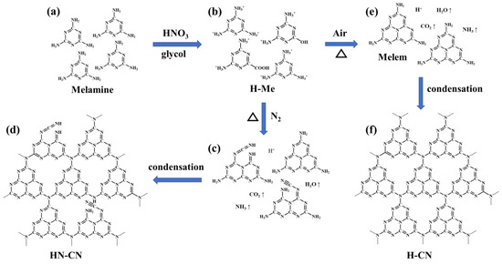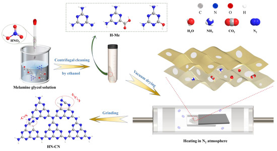 Melamine was chosen as the precursor of g-C3N4 because it possesses a triazine ring, which can minimize the effect of N2 atmosphere on the π-conjugated structure to obtain a more complete heptazine-based framework structure. Additionally, nitric acid not only protonates the -NH2 groups of melamine, but also allows the melamine molecules to self-assemble into rods and precipitate out, which facilitates the formation of a larger specific surface area after polymerization [21]. Figure 1 shows the schematic diagram of the synthesis of HN-CN. The weights of the final prepared CN, N-CN, H-CN, and HN-CN were 1.456 g, 1.875 g, 0.192 g, and 0.305 g, respectively (Figure S1a–d). Combined with Figure S1e, it can be seen that although the protonation of the precursor can enhance the specific surface area and polymerization of the product, it can also seriously reduce the yield. The increase in volume and weight of N-CN compared to CN and that of HN-CN compared to H-CN visually reflects the positive effect of heat treatment in N2 atmosphere for increasing the product yield, which is one of the reasons for using N2 atmosphere to introduce defects.