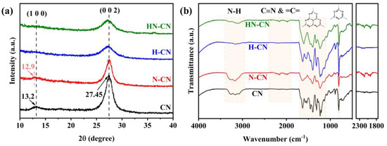 The information on crystal and chemical structure was detected to identify the end product. In the XRD pattern (Figure 2a), all samples exhibit a strong diffraction peak near 27.45°, corresponding to the stacking of the (002) crystal plane of g-C3N4, namely, the graphite layer. The other characteristic peak of g-C3N4 is located near 13.2°, which corresponds to the (100) crystal plane, the in-plane repeat of the heptazine ring [24]. The intensity of both characteristic peaks of N-CN is slightly reduced compared to CN, and the diffraction peak corresponding to the (100) crystal plane is shifted to a lower angle of 12.9°, reflecting the greater distance among the heptazine rings. The reason for this phenomenon may be that the introduction of many defects disrupts the long-range ordering of the g-C3N4 structure. It should be observed that the samples (H-CN and HN-CN) developed from the protonated precursor exhibit similar and markedly weaker XRD signals, because the shock of abundant endogenous gas causes a more fragmented, porous, thin layer structure to emerge.