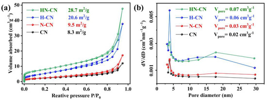 (a) N2 adsorption–desorption isotherms and (b) pore size distribution curves of CN, N-CN, H-CN, and HN-CN.