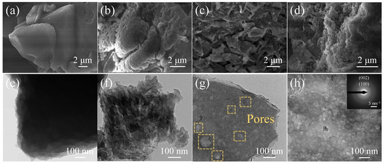 The above conclusions were verified by microscopic images. In the SEM images (Figure 4a–d and Figure S2), CN displays a conventional large bulk structure with a smooth surface, while N-CN shows a block made up of multiple compact bulks with a rough surface, where each block is composed of countless small and nearly fused grains. Both H-CN and HN-CN exhibit obvious sheet stacking structures, but there are more large fissures and holes in HN-CN. Similar results can be seen in the TEM images (Figure 4e h and Figure S3), where the surfaces of CN and H-CN (prepared in air) are visibly flatter than those of N-CN and HN-CN (prepared in N2), similarly only H-CN and HN-CN (polymerized by protonated precursor) show pores in the sheets. Additionally, two characteristic diffraction rings of g-C3N4 are observed in the selected area electron diffraction (SAED) pattern corresponding to (100) and (002) crystal planes [22], which is consistent with the XRD results. Additionally, the EDS elemental mappings (Figure S4) substantiate the uniform distribution of C and N elements in HN-CN.