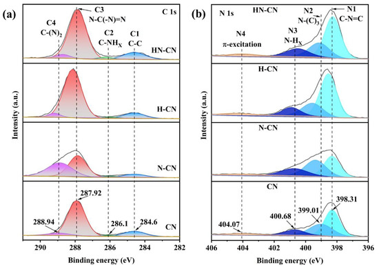 Next, looking at the high-resolution N 1s spectrum (Figure 5b), the four deconvoluted peaks located near 398.3 eV, 399.0 eV, 400.7 eV, and 404 eV originate from the sp2-hybridized nitrogen C-N=C (denoted as N1), the sp3-hybridized tertiary nitrogen N-(C)3 (denoted as N2), the amino nitrogen (denoted as N3), and the π-excitation effect (denoted as N4), respectively [32,33,34,35]. In combination with the percentage of different types of nitrogen (Table S3) to analyze shows that the proportion of N1 in N-CN compared to CN is reduced but not N2, and the amino nitrogen (N3) increases. This indicates that the preparation of g-C3N4 in N2 atmosphere mainly affects the formation of sp2-hybridized nitrogen in the framework of the heptazine ring, which is different from the results of heat treatment of already synthesized g-C3N4 in N2 atmosphere [14]. Similarly, H-CN exhibited the top polymerization among all the prepared samples because it had the highest N1 and lowest N3 percentages. The value of (N1+N2)/N3 is commonly used to reflect the degree of nitrogen defects in g-C3N4 [20]. This value is 6.65 for H-CN is the maximum in all samples and corresponds to the least quantity of nitrogen defects, while the value falls in varying levels for the samples synthesized in the N2 atmosphere (3.6 for N-CN and 5.47 for HN-CN), confirming the induction of nitrogen defects by N2 atmosphere. Finally, HN-CN well combines the advantages of heat treatment in N2 atmosphere and the protonation of the precursor, improving the degree of polymerization while retaining a moderate quantity of defects (e.g., -C≡N, N=C=N). As an addition here, it can be seen that in the C 1s and N 1s spectra of H-CN, all peaks are shifted to the direction of high binding energy, which is due to fewer defects and more interconnection of heptazine rings, resulting in a larger and more structurally complete graphite layer, thus increasing the overlap and expansion of π-orbital.