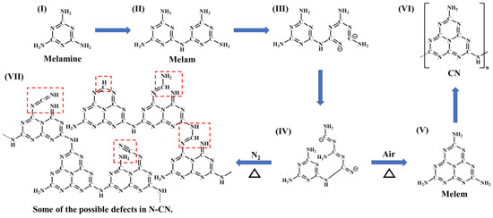 Through a comprehensive analysis of the above conclusions, the synthetic route and the ultimate chemical structure of each sample could be supposed. Firstly, we analyze the effect of N2 atmosphere on the synthesis of g-C3N4 (Figure 6): it is well known that in the classical synthetic pathway, with the temperature rise, melamine (I) will first combine two by two to melam (Ⅱ), then synthesize to melem (V), further condense to melom (Ⅵ), and finally produce the ideal g-C3N4 [36]. However, the g-C3N4 synthesized in N2 atmosphere appears the disruption of the C-N=C and N=C(-N)-N structure in the heptazine ring, so it can be speculated that the defects introduced by N2 atmosphere are formed during the transition from melam (Ⅱ) to melem (V). Considering that N2 is very stable chemically and often used as a protective gas, the main difference between N2 and air is that air also contains a large amount of O2 (about 21%). Ergo, we suppose that as the temperature rises one of the triazine-rings in melam (Ⅱ) breaks (as shown in Figure 6 Ⅲ), followed by a rotation and rearrangement of chemical bonds (as shown in Figure 6 Ⅳ), and finally removing two -NH2 groups to produce a melem (V) and two ammonia molecules. When O2 is present, the above process will happen more easily because oxygen, as the most common oxidizer, has a great tendency to trap electrons. When this process happens in N2 atmosphere, the subsequent deamination process (Ⅲ → Ⅳ) is not carried out thoroughly due to the lack of O2 assistance, thus producing partial defects. The polymerization pathway of the protonated precursor is shown in Figure 7. The additional protons facilitate deamination (release of more NH3) and therefore allow the polymerization reaction to occur more completely. Additionally, the -N=C=NH and -C≡N groups can be kept because they are hard to denitrogenate. Ultimately, under the synergistic effect of N2 atmosphere (without O2 assistance) and protonated precursor (promoting polymerization), HN-CN retains a small count of defects (e.g., C=NH and C≡N groups) based on obtaining a higher degree of polymerization.