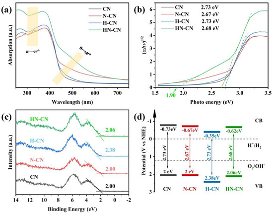 (a) UV−Vis DRS spectra, (b) plots of converted Kubelka–Munk functions vs. photon energy, (c) XPS VB spectra, and (d) corresponding electronic band structures of CN, N-CN, H-CN, and HN-CN.