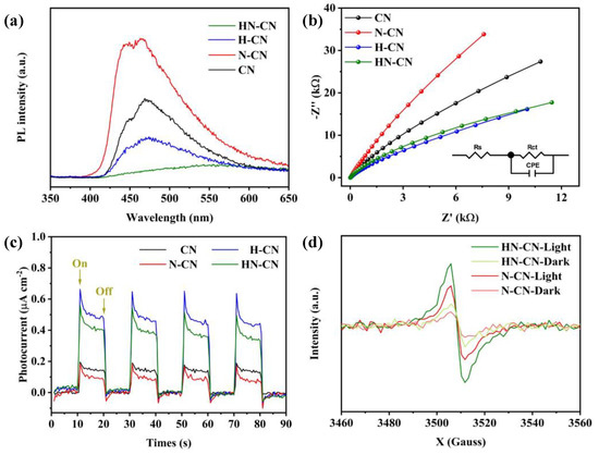 (a) Steady-state PL spectra, (b) EIS Nyquist plots, and (c) transient photocurrent response of CN, N-CN, H-CN, and HN-CN, (d) EPR spectra of N-CN and HN-CN.