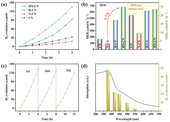 Due to the much greater specific surface area, higher polymerization, improved electronic structure, good visible-light absorption, electron transport capabilities, and increased carrier density, HN-CN has outstanding photocatalytic hydrogen evolution performance (Figure 10a). We further calculated the hydrogen evolution rate (HER) for each sample (Figure 10b), where the HER of HN-CN reached 675.5 μmol∙h−1∙g−1 which was 7.5 times higher than that of N-CN (89.9 μmol∙h−1∙g−1) and 4.1 times higher than that of CN (164.5 μmol∙h−1∙g−1). This indicates that the hydrogen evolution activity can be significantly improved by controlling the quantity and type of defects in g-C3N4 polymerized in N2 atmosphere. For excluding the effect of specific surface area on performance enhancement, the HER per surface area (HERs) was also calculated (Figure 10b). It can be seen that the HERs of HN-CN is still higher than that of CN and H-CN, reflecting the important role of the defects retained in HN-CN in regulating the electronic structure and enhancing the performance of photocatalytic hydrogen evolution.