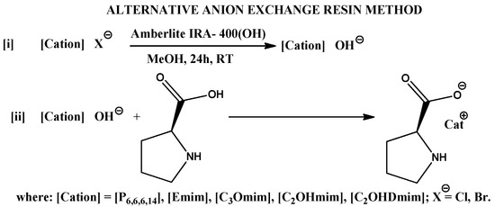 Commercially available reagents L-proline (MW = 115.13 g·mol−1, CAS No. 147-85-3), ionic liquids and solvents were purchased from Alfa Aestar (Haverhill, MA, USA), Aldrich (St. Louis, MO, USA), Solchemar (Alcácer Do Sal, Portugal), and were used without further purification. The basic anion-exchange resin Amberlite IRA-400-OH (ion-exchange capacity 1.4 eq.mL−1) was purchased from Supelco (St. Louis, MO, USA). The 1H and 13C NMR spectra were recorded at 25 °C on a Bruker AMX400 spectrometer (Bruker, Billerica, MA, USA) with TMS as internal standard. Chemical shifts are reported downfield in ppm. IR spectra were performed by Perkin Elmer model Spectrum 1000 (PerkinElmer, Waltham, MA, USA) using KBr plates for neat liquids. DSC analysis was carried out using a TA Instruments Q-seriesTM Q200 DSC (TA Instruments, New Castle, DE, USA) with a refrigerated cooling system. The samples for elemental analysis were performed by Laboratório de Análises at REQUIMTE, Departamento de Química Faculdade de Ciências e Tecnologia (Monte da Caparica), using Thermo Finnigan-CE Instruments equipment and the model Elemental Analyzer 1112 series. Optical rotations were recorded on a Perkin Elmer 241MC. The melting point (mp) was determined using Electrothermal Melting Point Apparatus. The decomposition temperatures were measured with the Simultaneous Thermal Analyzer STA 449 F3 Jupiter, using a nitrogen atmosphere (mass changed in % or mg). Rheology studies were performed at Instituto Jean Piaget in Almada, Portugal, using a Rheometer (RS-300, Haake, Vreden, Germany). Measurements were carried out using a controlled-stress rheometer fitted with a coneplate sensor C20/2° Ti. The torque amplitude was imposed using a logarithmic ramp of shear stress, which was increased in 30 min intervals from 0.01 to 1000 Pa to decrease the initial acceleration and the effects due to instrument inertia. The temperatures of the samples were maintained at (20 ± 0.5) °C by means of a circulating water bath (DC30, Haake, Germany), and they were measured with a thermocouple attached to the stationary element. The temperature dependence of the viscosity was also studied. The ILs were heated from 20 to 70 °C (0.5 °C·min−1) using a constant shear stress of 5 Pa. All the measurements were performed at least twice. High performance liquid chromatography (HPLC) analysis was carried out using a HPLC Waters® system (Milford, MA, USA) coupled with a pump and a controller (Waters® 600), an in-line degasser (X-Act-4 channels, Jour Research), an autosampler (Waters® 717 plus), and a photodiode array detector (DAD, Waters® 996). Enantiomer separations were performed with a Phenomenex Lux 5μ Cellulose-1 column (250 × 4.6 mm i.d.) coupled to a Phenomenex safety guard column (security guard cartridges, Lux Cellulose-1 4 × 3.0 mm i.d.) (Torrence, CA, USA). Depending on the final product, chiral compounds were eluted in an isocratic mode with hexane at 95% and 2-propanol at 5% or in a gradient mode (0–25 min, hexane:2-propanol 90:10; 25–30 min, hexane:2-propanol 80:20; 30–35 min, back to hexane:2-propanol 90:10 hold till 40 min). The flow rate was set at 0.8 mL·min−1 for the isocratic mode and 1.0 mL·min−1 for the gradient mode. The injection volume was between 20 to 75 μL. Before injection, samples were dissolved in 2-propanol and filtrated with GHP Acrodisc® syringe filters. The chromatograms were acquired with a MassLynxTM software data acquisition system. Chiral products were identified at 230 nm. Reagents and materials: hexane (Sigma-Aldrich for HPLC) (St. Louis, MO, USA), 2-propanol (Sigma-Aldrich HPLC Plus) (St. Louis, MO, USA), and GHP Acrodisc® 13 mm syringe filter with 0.45 μm GHP membrane (PALL Life Sciences, Ann Arbor, MI, USA).