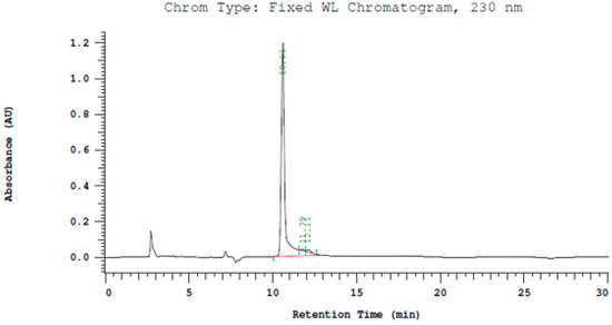 Chromatogram obtained for the analysis of product A using [Choline][ProCO2] as catalyst and [Bmim][DCA] as reaction media (ee = 97%). The enantiomeric excess was determined using chiral HPLC (Phenomenex Lux 5 µm i-Cellulose-250 × 4.6 Chiral Column, hexane: i-propanol, 10/90, flow: 1 mL/min, λ = 230 nm): tR = 10.61 min (major) and tR = 12.11 min (minor).