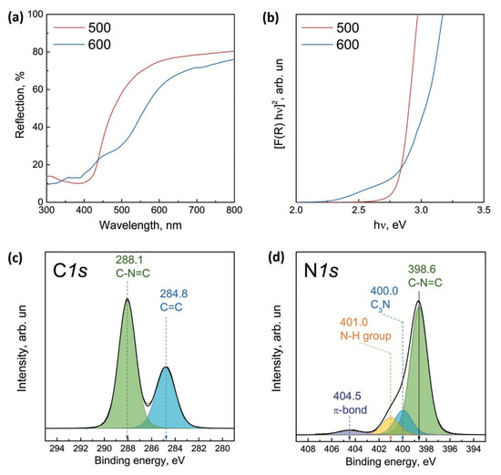 Diffuse reflectance spectra of g-C3N4 (a) and Tauc’s plots depending on the calcination temperature of melamine (b); C1s (c) and N1s (d) core-level spectra of g-C3N4 obtained from melamine at 600 °C. The N1s spectrum is normalized to the integral intensity of the C1s peak corresponding to the spectrum of g-C3N4.