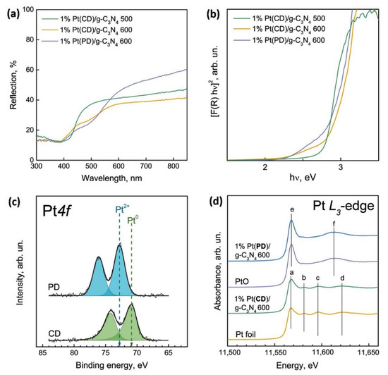 Diffuse reflectance spectra of 1%Pt/g-C3N4 (a) and Tauc’s plots depending on the deposition method of Pt (b); Pt4f core-level spectra (c) and Pt L3-edge (d) spectra of Pt in 1%Pt/g-C3N4 catalyst obtained from melamine at 600 °C. The Pt4f core-level spectrum is normalized to the integral intensity of the C1s core-level peak corresponding to the spectrum of g-C3N4.