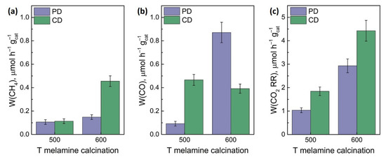 The activity of the synthesized photocatalysts was studied in the reaction of CO2 reduction under the irradiation of LED-397, LED-427, and LED-452 with the addition of 1 mL of water in the reactor. At the first stage, the influence of the melamine calcination temperature on the activity of the obtained photocatalysts 1% Pt/g-C3N4 was studied. The highest rates of CH4 formation and overall CO2 reduction rate are achieved over the samples obtained at 600 °C (Figure 4), which is explained by the largest specific surface of the samples (Table 1) and, as a result, a high number of adsorption sites.