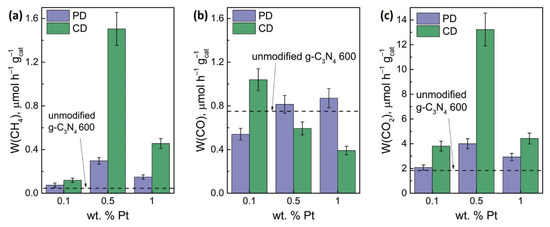 The highest rate of total reduction of CO2 was achieved over the 0.5% Pt(CD)/g-C3N4 600 photocatalyst and equal to 13.2 µmol h–1 g–1 under irradiation with λ = 397 nm, which exceeds the activity of unmodified g-C3N4 obtained by calcining melamine at 600 °C by a factor of 7.