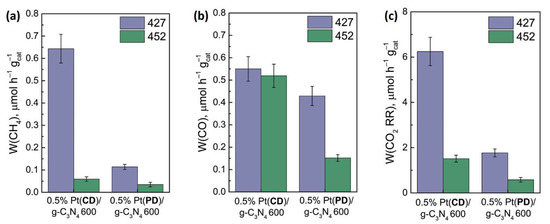 The most active photocatalysts 0.5% Pt(CD)/g-C3N4 600 and 0.5% Pt(PD)/g-C3N4 600 were tested in the CO2 RR using LED-427 and LED-452 as sources of light irradiation (Figure 6). The highest activity was demonstrated by the sample obtained from melamine at 600 °C and modified with platinum by the chemical deposition method (0.5% Pt(CD)/g-C3N4 600). Under LED-427 irradiation, the overall CO2 reduction rate was 6.2 µmol h–1 g–1 (AQE = 0.13%).