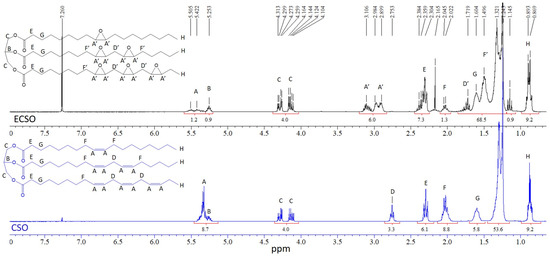 Figure 2. NMR spectra of CSO (cottonseed oil) and ECSO (epoxidized cottonseed oil).