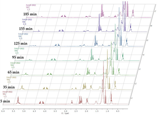 The NMR spectra of intermediate samples taken during the reaction are shown in Figure 2. With the epoxidation programming, the peak intensity of the CH=CH double bond was clearly decreased, while the signal of the oxirane ring conversely appeared at 3.00 ppm.