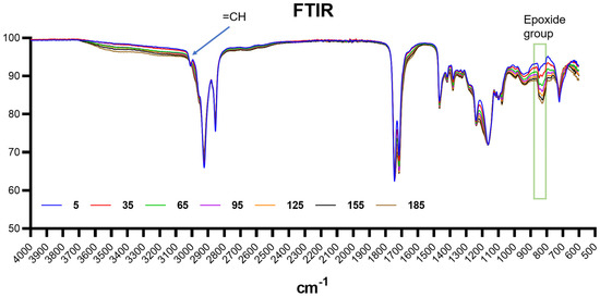 Figure 4. FTIR spectra of ECSO (epoxidized cottonseed oil) at different reaction times (5, 35, 65, 95, 125, 155, and 185 min) performed at 70 °C.