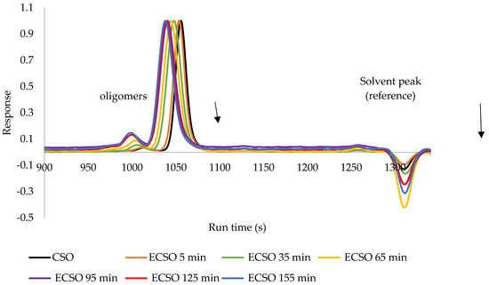 Figure 5. GPC chromatograms of CSO (cottonseed oil) and ECSO (epoxidized cottonseed oil) at different reaction times performed at 70 °C.