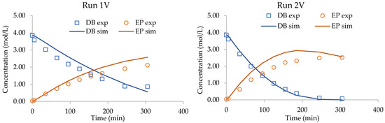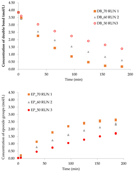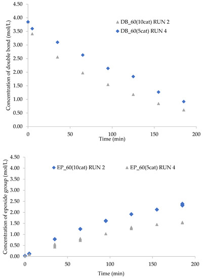 The catalyst Amberlite IR-120 catalyzes the perhydrolysis reaction [48,50], in other words, the rate of perpropionic acid production. Runs 2 and 4 were compared to evaluate the effect of catalyst loading on the rate of epoxidation. Figure 8 shows that the rate of epoxidation increases with the increase in catalyst loading from 5 to 10 g. The presence of ring-opening reactions can be also noticed based on comparing the concentrations of DB and EP at 185 min.