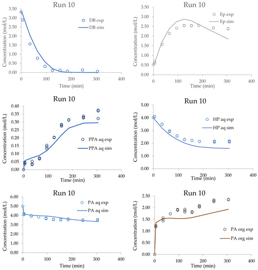 where k P P A o r g and k P A o r g are mass transfer coefficients of PA and PPA in the organic phase, a is interfacial area between the organic and aqueous phases, and K P P A and K P A are the distribution coefficients for PA and PPA. In Equations (5)–(13), we used bulk concentrations in the aqueous and organic phases.