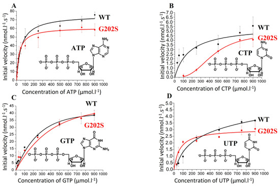 Therefore, in this study, we sought to investigate the ways in which the main cellular nucleoside triphosphates (ATP, CTP, GTP, and UTP) influence the kinase reaction of wild-type (WT) human HRI and its G202S mutant.
