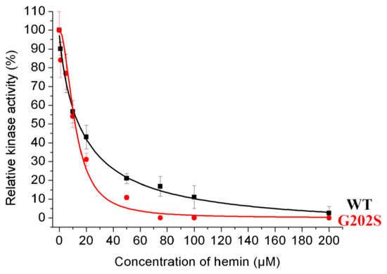 HRI, as a typical heme-responsive sensor enzyme, can detect changes in heme concentration. A sufficiently high heme concentration can inhibit the eIF2α kinase reaction. We examined the heme-mediated inhibition of the HRI WT enzyme and the HRI G202S mutant kinase reactions utilizing nucleoside triphosphates. As summarized in Table 2, we found no significant difference in the sensitivity to heme inhibition (IC50 values) for the two forms of HRI tested. However, when ATP served as a substrate of the kinase reaction, the HRI G202S mutant was slightly more sensitive to heme inhibition compared to the HRI WT enzyme (Figure 3).