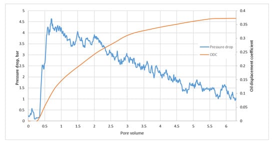 The dynamics of changes in pressure drop and oil displacement coefficient in the third experiment are shown in Figure 3.