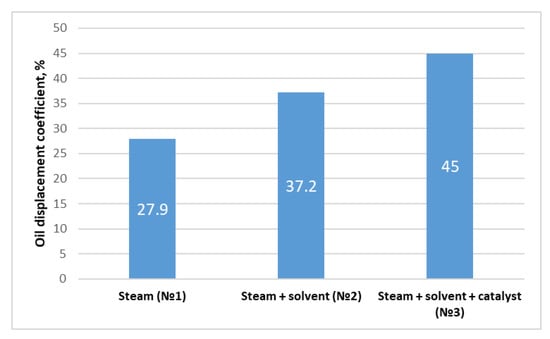 From the results of physical modeling of oil displacement coefficient determination, in the first experiment with steam injection, (T = 300 °C) oil displacement was 27.9%. The presence of a solvent increases oil displacement by 9.3% and up to 37.2%. In experiment 3, when a catalyst is added, oil displacement equaled 45%, which testifies to the increase in oil displacement efficiency by steam when using a solvent and a catalyst solution, given the increase in oil recovery by 1.3 and 1.6 times, respectively. Summary results of oil displacement coefficients are presented in Figure 4.
