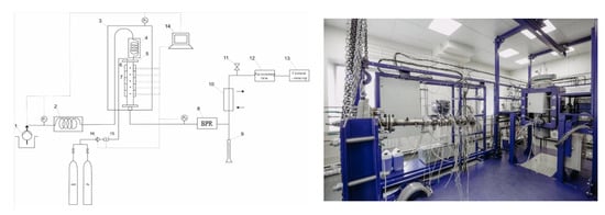The studies were carried out on a unique scientific facility for physical and chemical modeling of in situ combustion and vapor-gravity drainage (Registration Number 2083849, Russian Federation), presented in Figure 8. A detailed description of the setup is presented in [33,34].