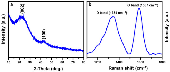 (a) X-Ray diffraction spectrum and (b) Raman spectrum of RCS derived activated carbon (RCS-AC).