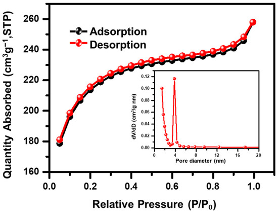 N2 adsorption-desorption analysis isotherm of RCS-AC (inset shows magnified view of BJH showing pore size distribution).