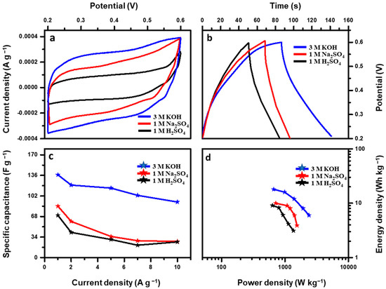 Based on the molar ionic conductivity of K+, Na+ and H+, KOH electrolyte had the highest specific capacitance, followed by Na2SO4 and H2SO4. A high molar conductivity electrolyte will allow easy percolation of ions in the electrode material leading to a higher specific capacitance. KOH also exhibits a sustainable capacitance with increasing scan rates when compared to the other two electrolytes. The specific capacitance of a supercapacitor is determined by the pore structure of its electrode material and the degree to which its electrolyte matches its pore size [50]. The Ragone plot of activated carbon derived from RCS is given in Figure 5d, which demonstrates its energy and power density. The specific capacitance of a supercapacitor is directly proportional to its energy density. Consequently, the RCS derived activated carbon exhibits a maximum energy density of 18.2 W hkg−1 at 663.4 W kg−1 in KOH electrolyte and 6.2 W hkg−1 at 2420.9 W kg−1. In Na2SO4 electrolyte, it shows a maximum energy density of 10.5 W kg−1 at a power density of 715 W kg−1, while in H2SO4 electrolyte, it shows a maximum energy density of 9.06 W kg−1 at a power density of 635.6 W kg−1, outperforming other ACs derived from lotus seedpods [51], chicken feathers [52], corn husks [53], 3D flowerlike carbon [54], jujube pits [55], waste tea leaves [56]. Performance comparison of activated carbon derived from different biomass is given in Table 1.