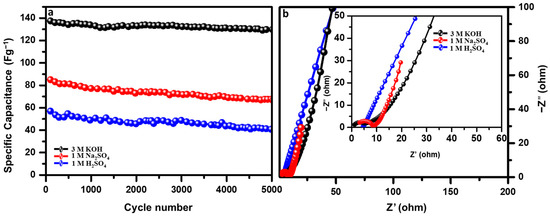 It is also important to consider the cycle life of supercapacitors. In Figure 6a, galvanostatic charge/discharge measurements were used to evaluate the long-term cyclic stability of capacitance performance with acidic, basic and neutral electrolytes. Cyclic stability of 97.2%, 93.6% and 84.8% was achieved for the electrolytes KOH, Na2SO4 and H2SO4 at 5000 cycles. KOH electrolyte demonstrates good cyclic charge and discharge performance for activated carbon derived from RCS. The increased stability of the electrode material may be attributed to the presence of surface carbonyl and oxygen functional groups in the RCS derived activated carbon, which may cause redox reactions with KOH electrolyte. As a result, it is evident that the activated carbon derived from Ricinus communis shell is electrochemically stable with long-term cycle life.