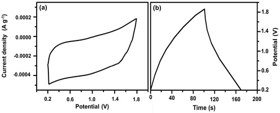 Further to understand the practicality of the fabricated electrode with a two-electrode system and a broad operating voltage, the CV tests were performed from 0.0 to 1.8 V vs. Ag/AgCl (Figure 7a). The curves were rectangular shaped and shows that the electrode is beneficial for charge storage. Further the galvanostatic charge discharge curves recorded at 1 A g−1 current density showed that the curves were symmetric with a calculated specific capacitance of 115 F g−1. These results suggest that the symmetric cell has very good electrochemical reversibility and possesses ideal capacitive nature.