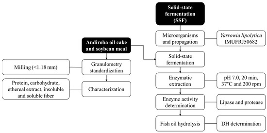 The strategy adopted to produce lipase by Yarrowia lipolytica in SSF using the combination of andiroba oil cake and soybean meal in different proportions was based according to the flowchart shown in Figure 1.