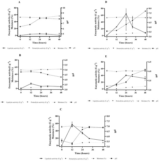 The initial pH of the matrices is acidic due to the presence of free fatty acids present in the oleaginous matrix, and this condition favors Yarrowia lipolytica growth since this yeast needs a lightly acid medium for good growth [33], avoiding a medium buffering step. There is also a gradual increase in pH along the process in the matrices ranging from 6.39 to 7.32 (Figure 2A), 5.69 to 6.82 (Figure 2C), 5.64 to 7.68 (Figure 2D), and 5.21 to 6.03 (Figure 2E). In the matrix containing only andiroba oil cake, a gradual decrease in pH (4.8 to 4.26, Figure 2B) was observed due to the oil residual content in the solid medium since the oil is initially hydrolyzed by lipase, not being consumed by the yeast in the initial hours, thus maintaining a slightly acidic pH.