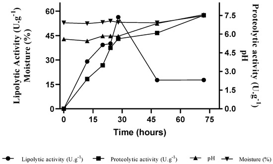 SSF was evaluated using different combinations of andiroba oil cake and soybean meal (0:100; 25:75; 50:50; 75:25 and 100:0) at different times (0, 12, 24, 32, and 48 h). Afterward, the supplementation of the solid matrix containing andiroba oil cake and soybean meal (50:50) was evaluated adding 1.5 (% w/v) soy oil over time (0, 12, 14, 20, 24, 28, 48, and 72 h) to obtain an increase in lipolytic activity. In addition, the presence of Tween 80 (0.001% w/v) in the fermentation medium containing 1.5 (% w/v) soybean oil was tested. Fermentation was monitored by determining the lipase and protease activity as well as the moisture and pH (described in Subsection “3.6. Analytical determinations”).